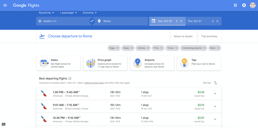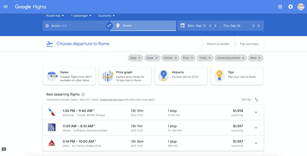 I’ve entered departure airport Austin and arrival airport Rome and my ideal dates in September. With this search, I see that the fare is about $1500 round trip with one stop.